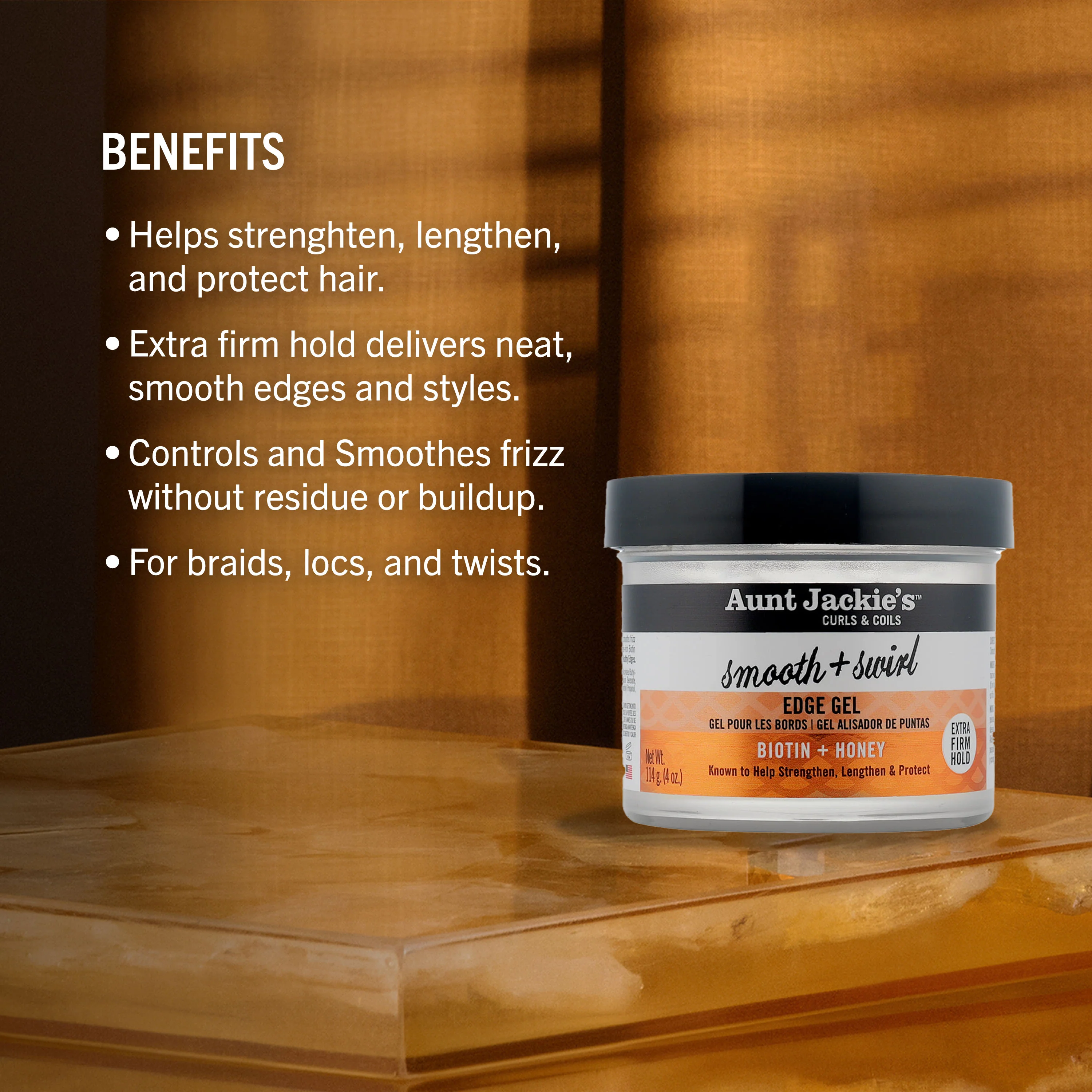 Be a Baby Hair Baddie!Ā Aunt Jackieās Braid + Twist Collection Smooth + Swirl Edge Gel with Extra Firm Hold gives you the control you crave and smooths frizz without residue or build up.Ā Specially blended with the dynamic duo of Biotin and Honey, this extra firm edge gel allows you to enjoy neat, smooth styles with beautiful shine, while helping to strengthen, lengthen, and protect hair.Ā Lavish Honey supports moisture retention, while protein-rich Biotin reveals the natural beauty of braids, twists, and locs.Ā